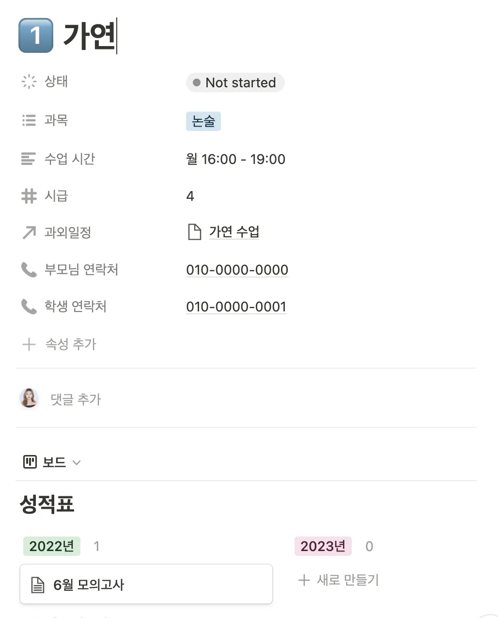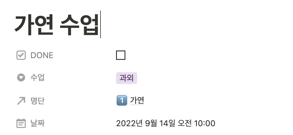 명단은 관계형 속성으로 입력하시면 명단 데이터베이스에서 학생별 일정을 모아보실 수 있습니다