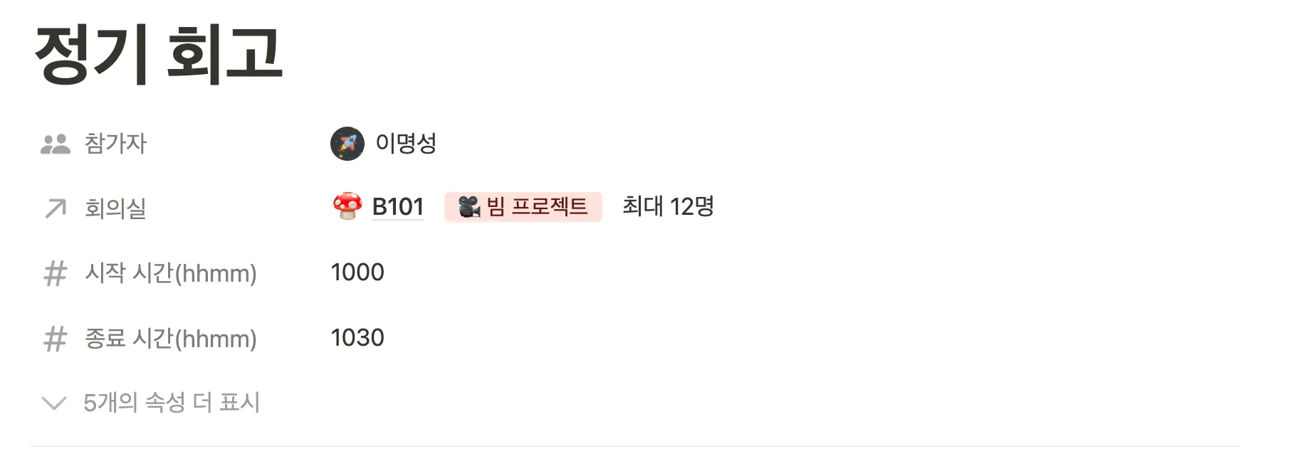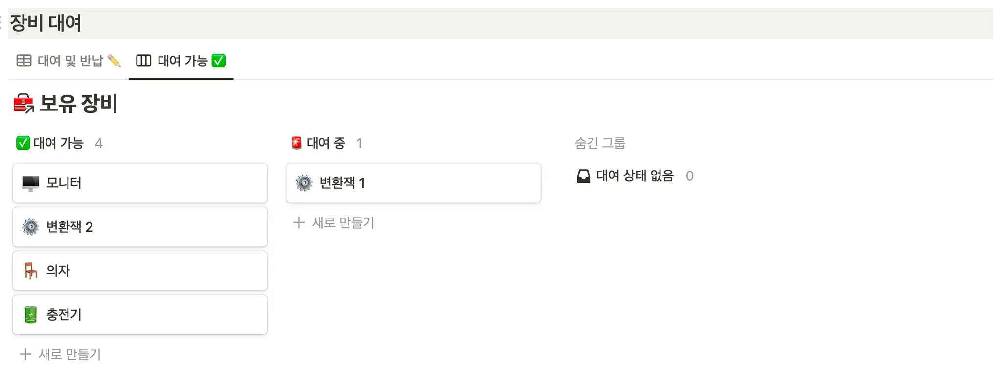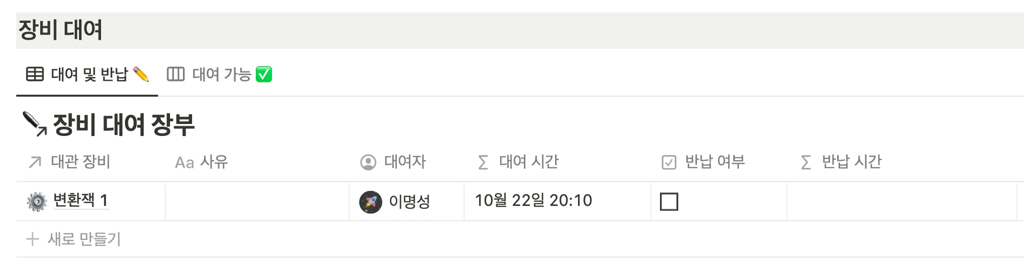 보기에서 대관한 장비를 기록합니다. 만약 반납을 완료했다면 반납 여부속성에 체크 표시하면 됩니다. 체크 표시된 시간이 반납 시간 속성에 자동 반영됩니다.