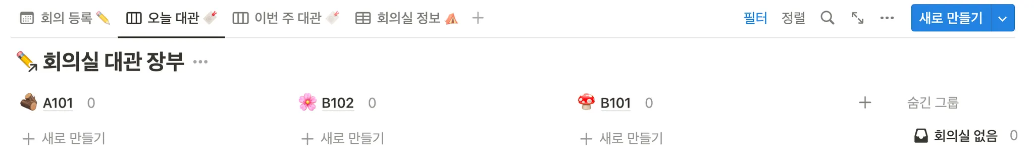 회의실 대관 영역에서 오늘 대관 현황이나 이번 주 대관 현황을 파악할 수 있습니다.